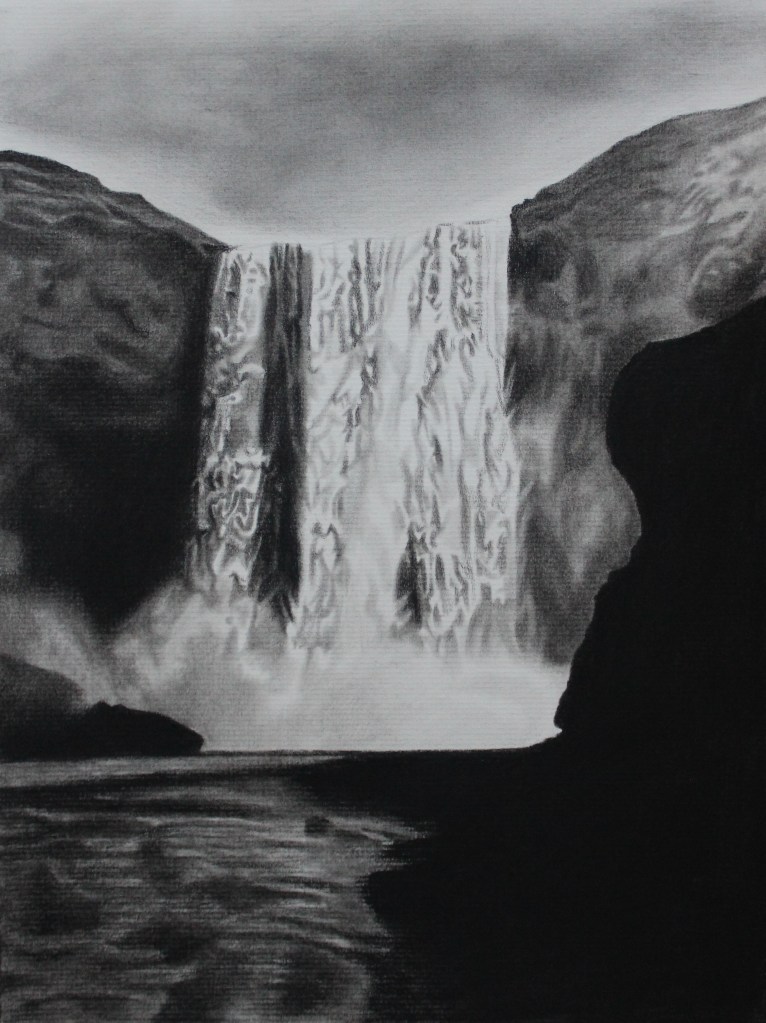He rose, beckoning me to follow him. We climbed a narrow ledge along the rocks until we reached a secret little cave behind the waterfall, hidden completely by the falls and the great rushing noise of their descent. The cave was empty, save for a stone pedestal in the center, cut out of the rock. Something lay atop it, and as I watched, a bright kaleidoscope of color beamed from its surface, dancing across the walls of the cave.