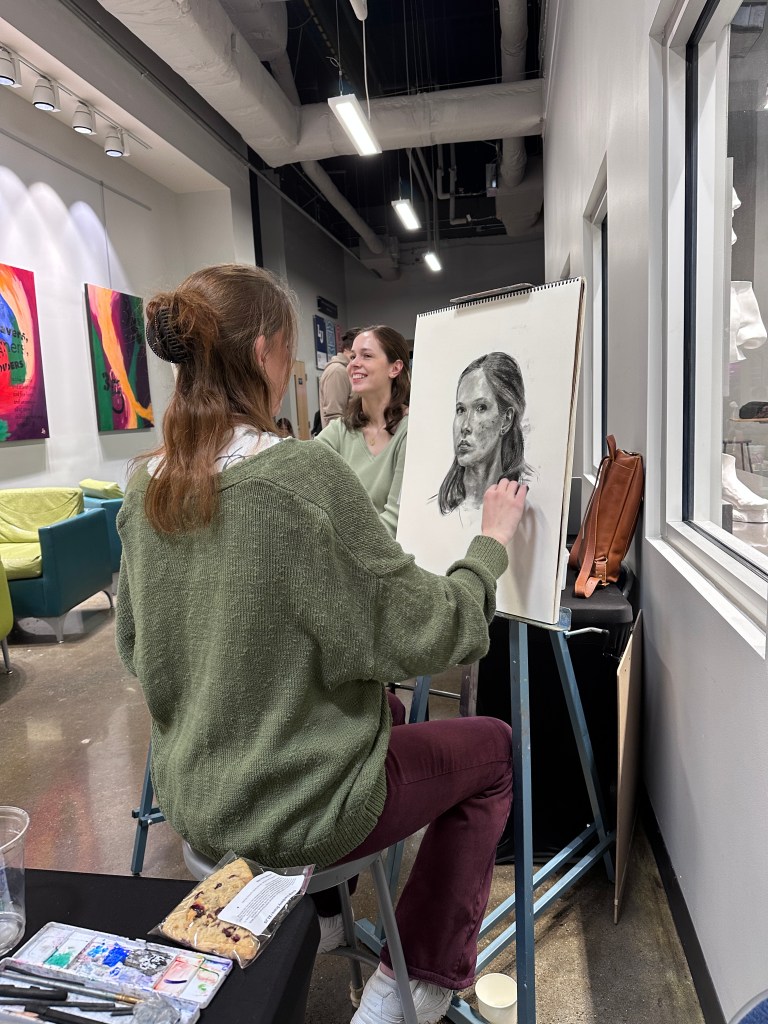 Drawing Natalie drawing seemed fitting, since art is an important part of who she is and something she loves to do. I got the chance to capture her look of intense concentration as she rendered my own, and during breaks between sessions we got up to examine each other’s work.