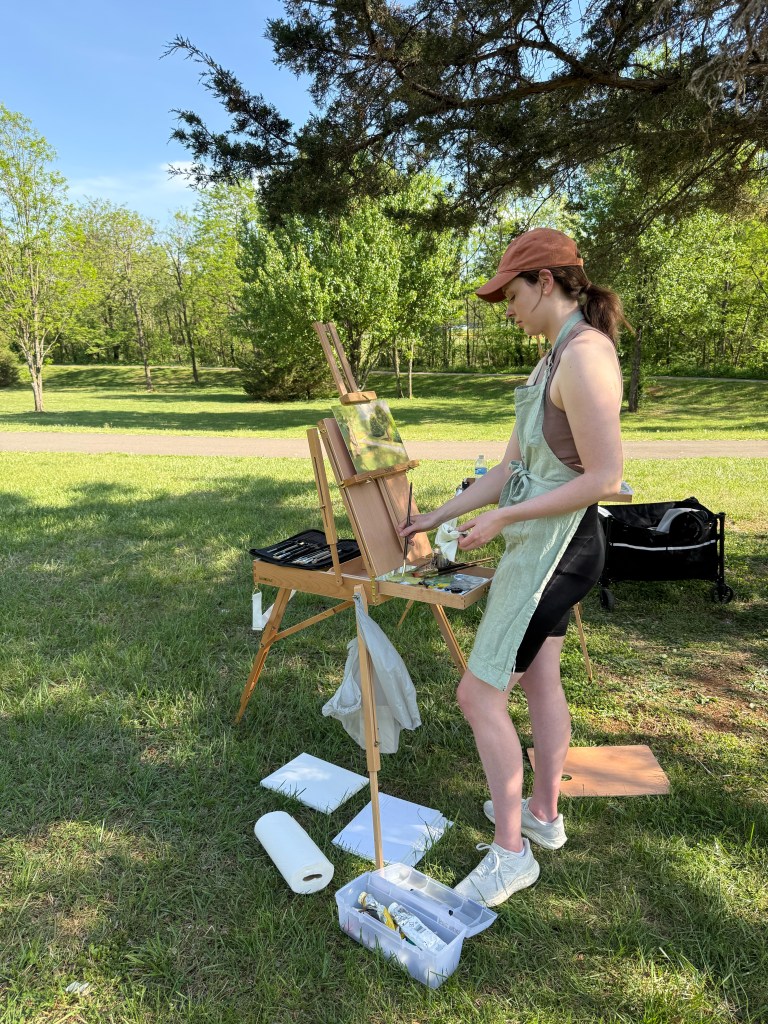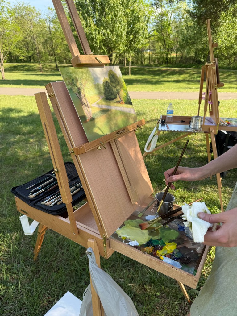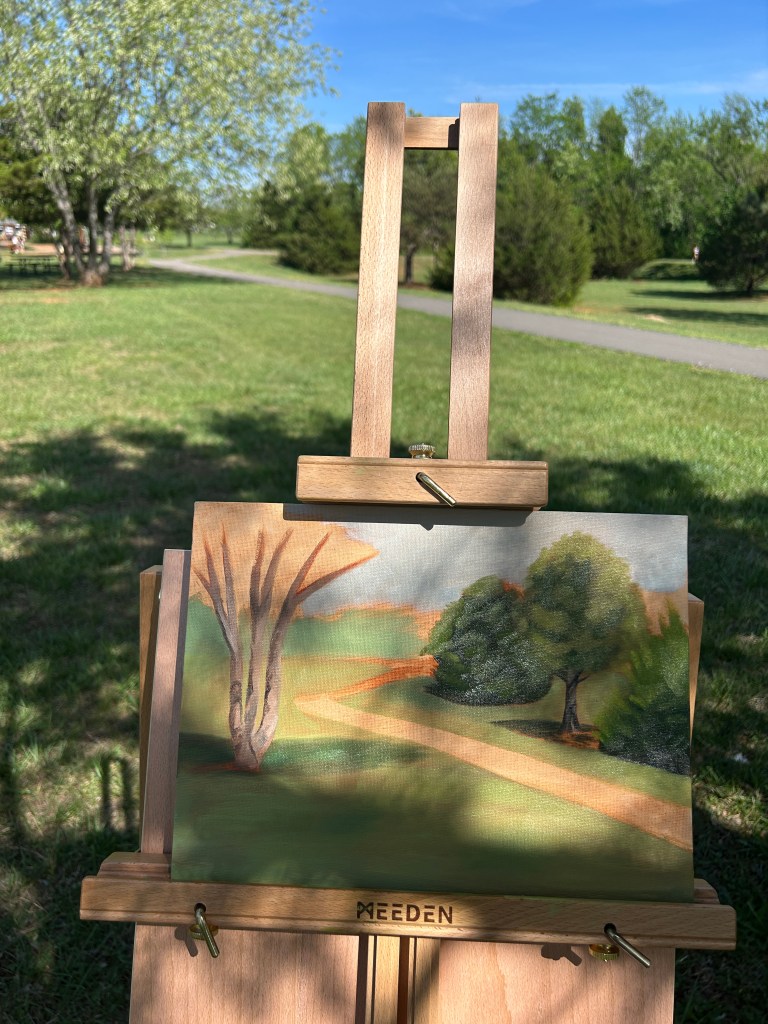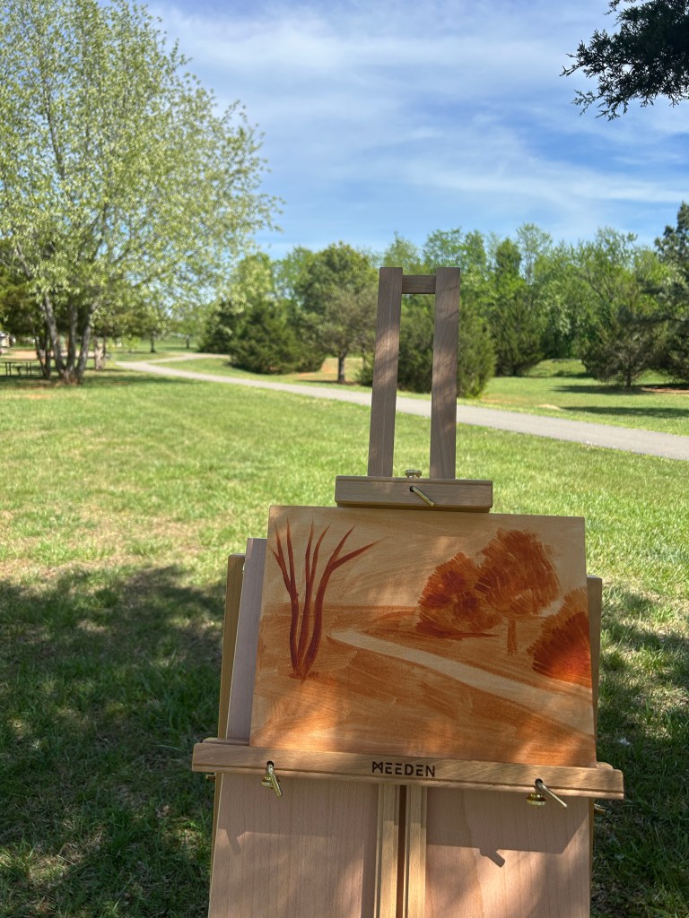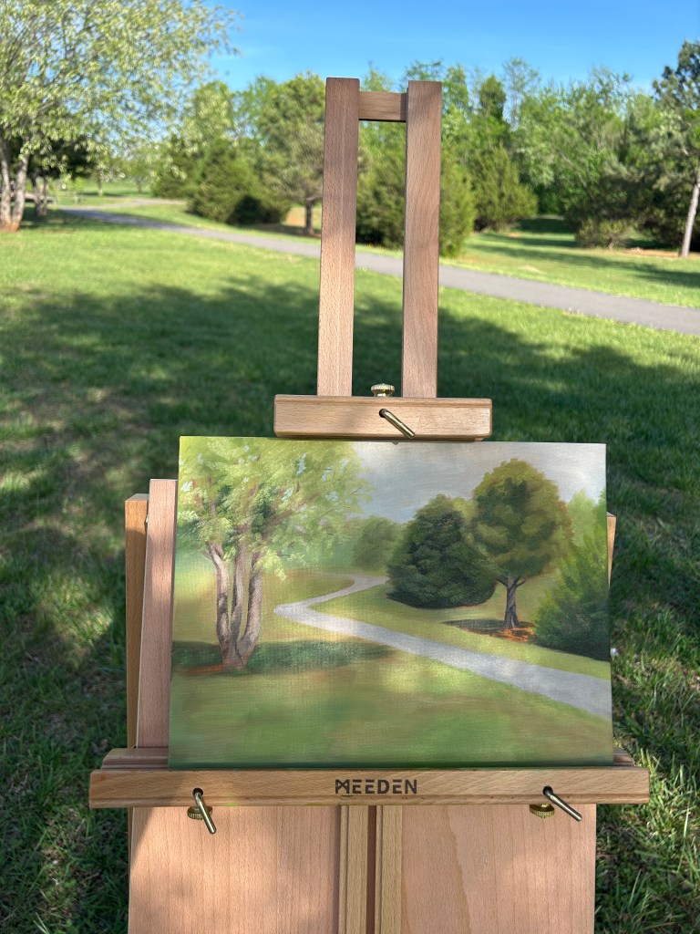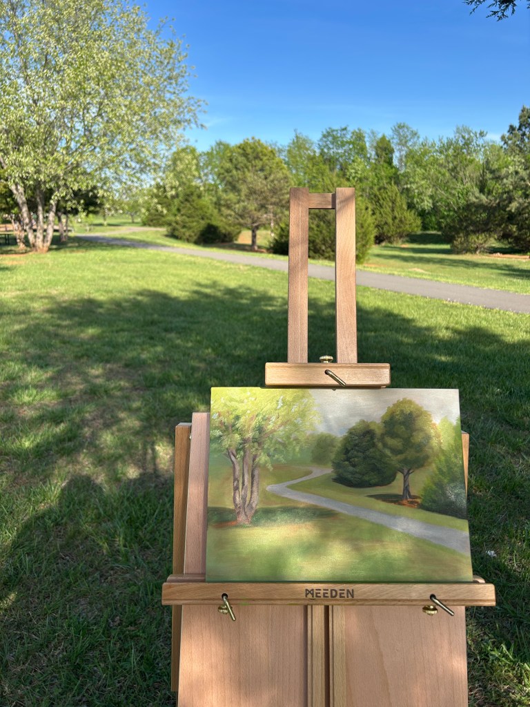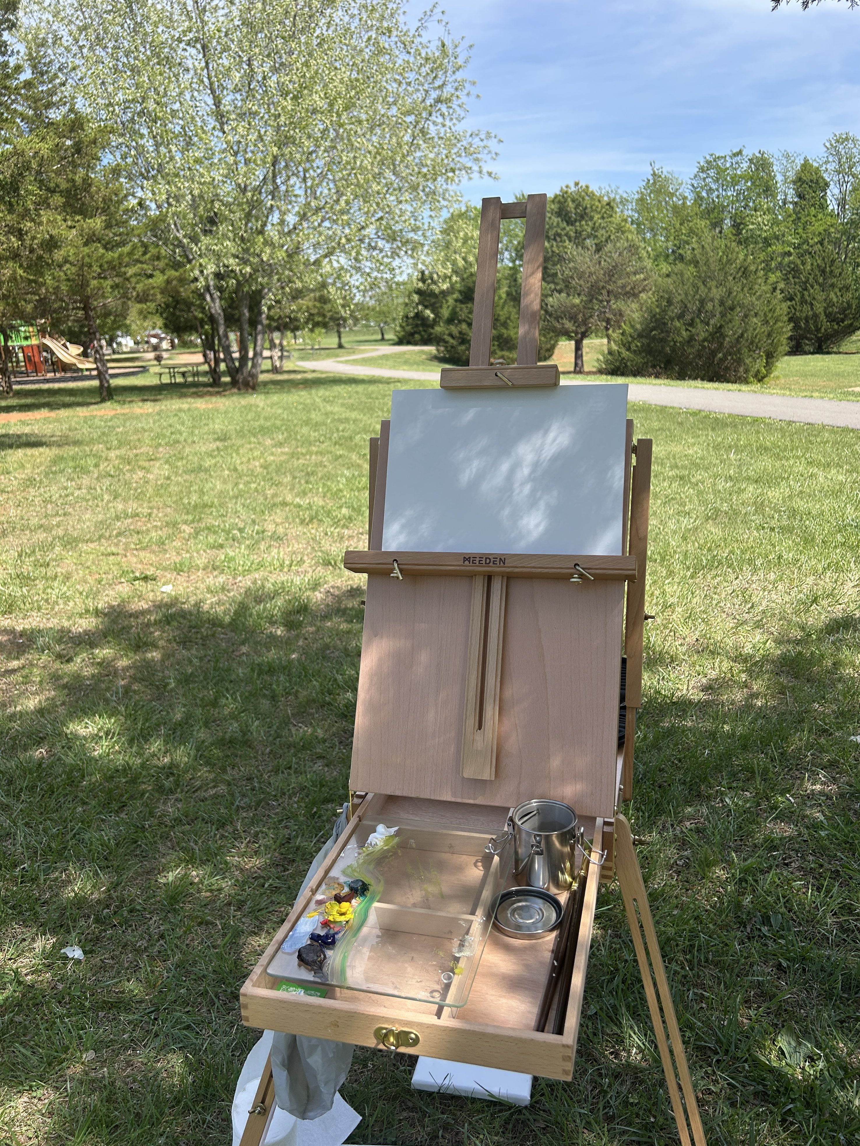 Thankfully, I’ve been out for three sessions so far, and each time I have been able to set up under the shade of a tree. (I always bring sunblock nonetheless.) Yesterday, despite the withering heat, I barely even broke a sweat during our nearly four hours of painting, set up, and clean up. A pleasant breeze was blowing, and the bugs (mostly) minded their own business.