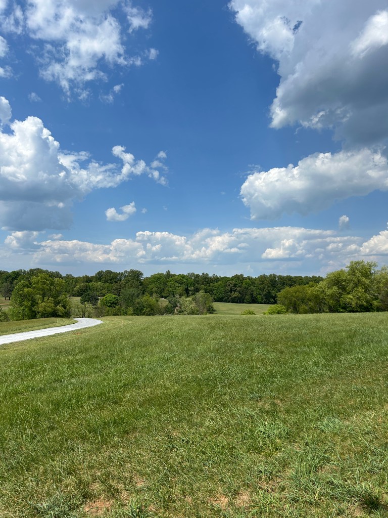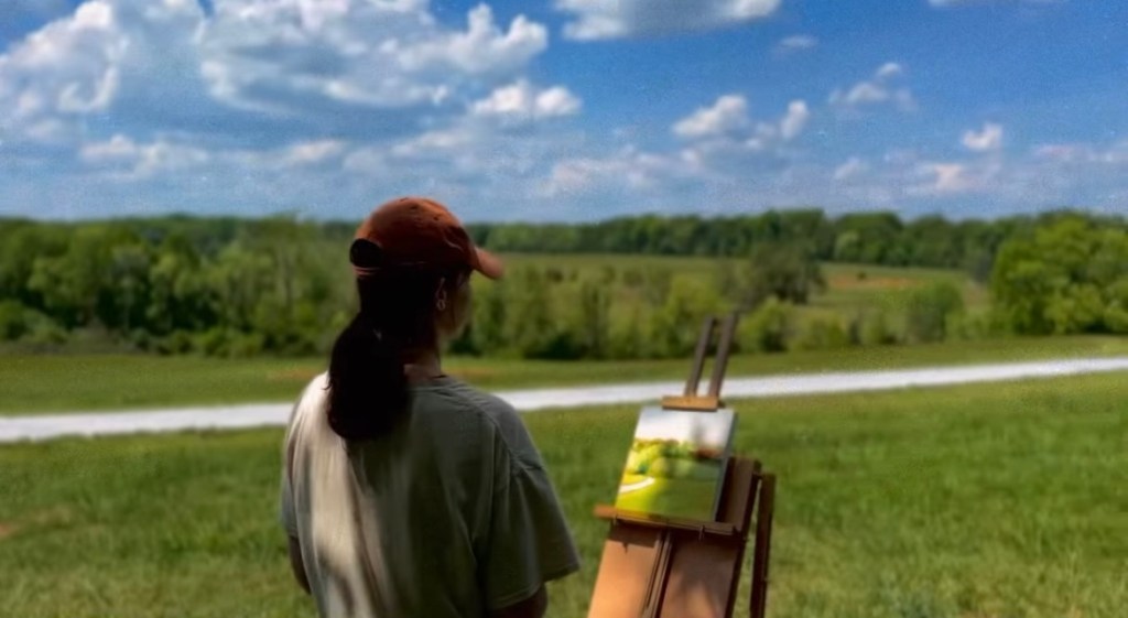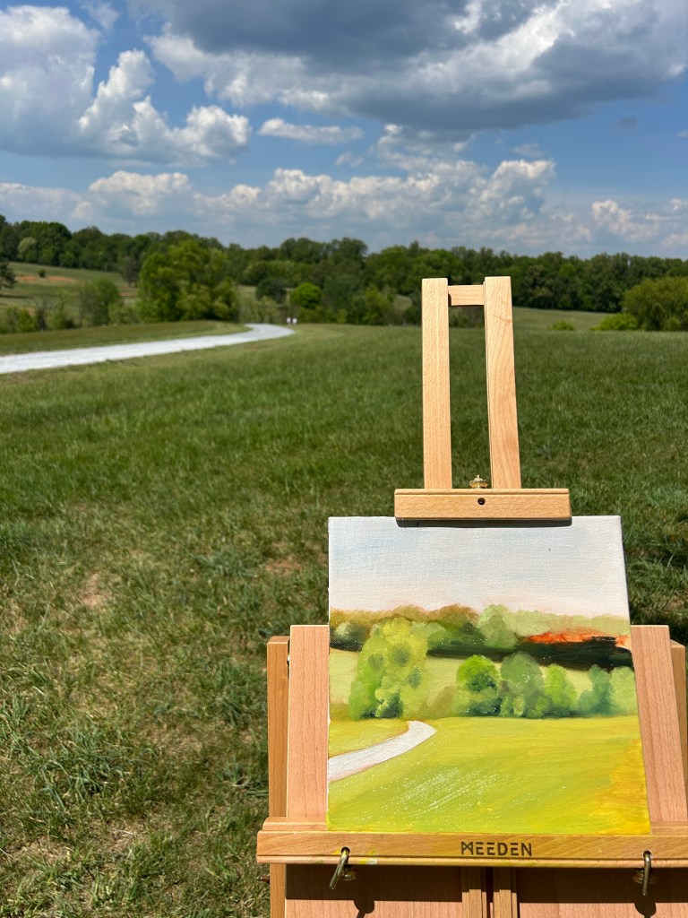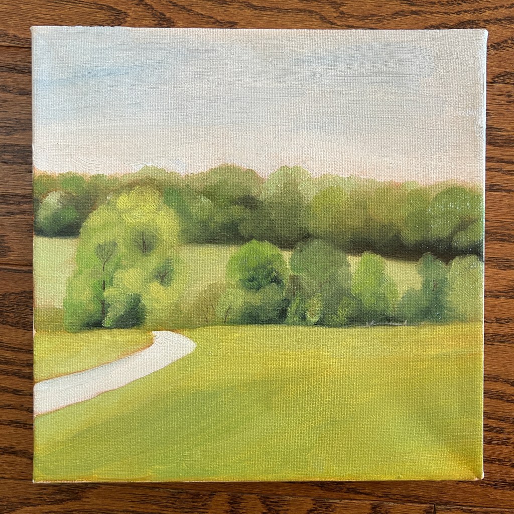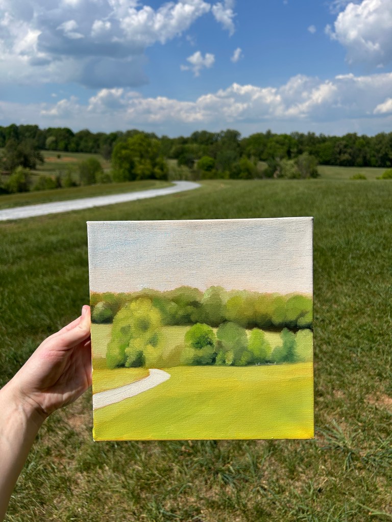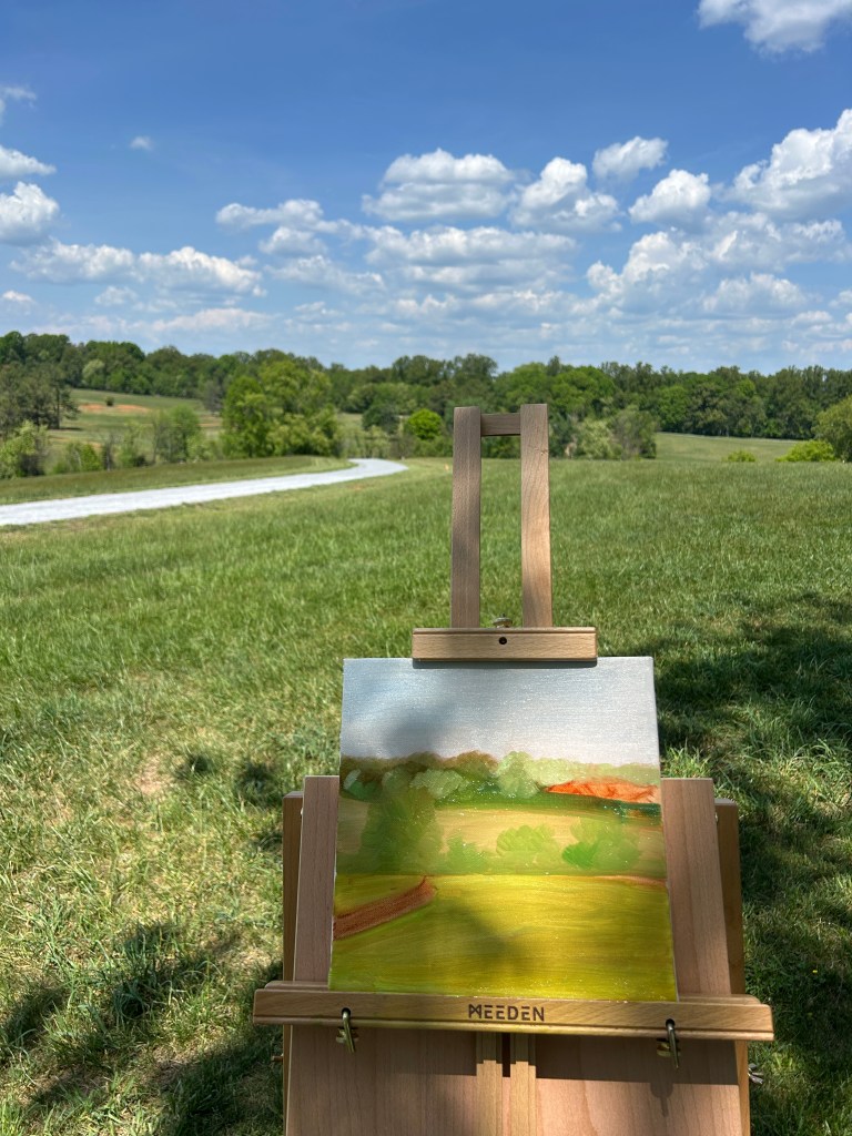 We chose to paint at Poplar Forest, a beautiful historic landmark in Forest, Virginia: Thomas Jefferson’s retreat plantation. It was a clear, sunny day, and we found refuge under the shade of a line of trees which followed the path up to the house. The surrounding landscape offered a plethora of scenes to paint, and each of us chose something different. I wanted to paint a pastoral landscape, capturing the softness of the fields and trees from a distance.