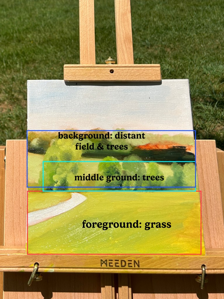 I followed my usual process, beginning with a burnt sienna underpainting, then blocking in major masses of color. Since this week’s focus was on color temperature and atmospheric perspective, I found it helpful to be painting a scene with such clear division between foreground, middle ground, and background. Here’s a basic map of how I divided my color temperatures:
