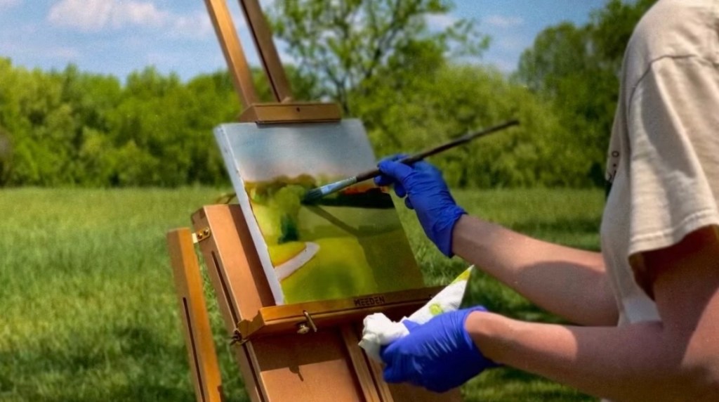 I’ve grown quite accustomed to my plein air painting setup, and after painting for four sessions, I’ve become more and more comfortable with my process and technique. I use the same color palette every time, usually the same four brushes, and LOTS of paper towels. I know my preferences: glass palette, mineral spirits, a combination of synthetic and bristle brushes.